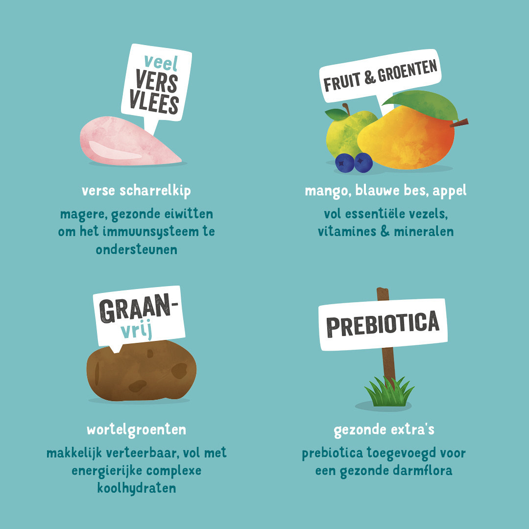 Samenstelling: verse kip 41%, aardappelen, erwten, erwteneiwit, kippenvet, lijnzaad, kippensaus, mineralen, visolie, mannan-oligosachariden (MOS), fructo-oligosachariden (FOS), mango 0,04%, bosbessen 0,04%, appels 0,04%, aardbeien 0,04%, wortels 0,04%, tomaten 0,04%, goudsbloemblaadjes, brandnetel, braambesblaadjes, venkel, karwij, kamille, melisse.