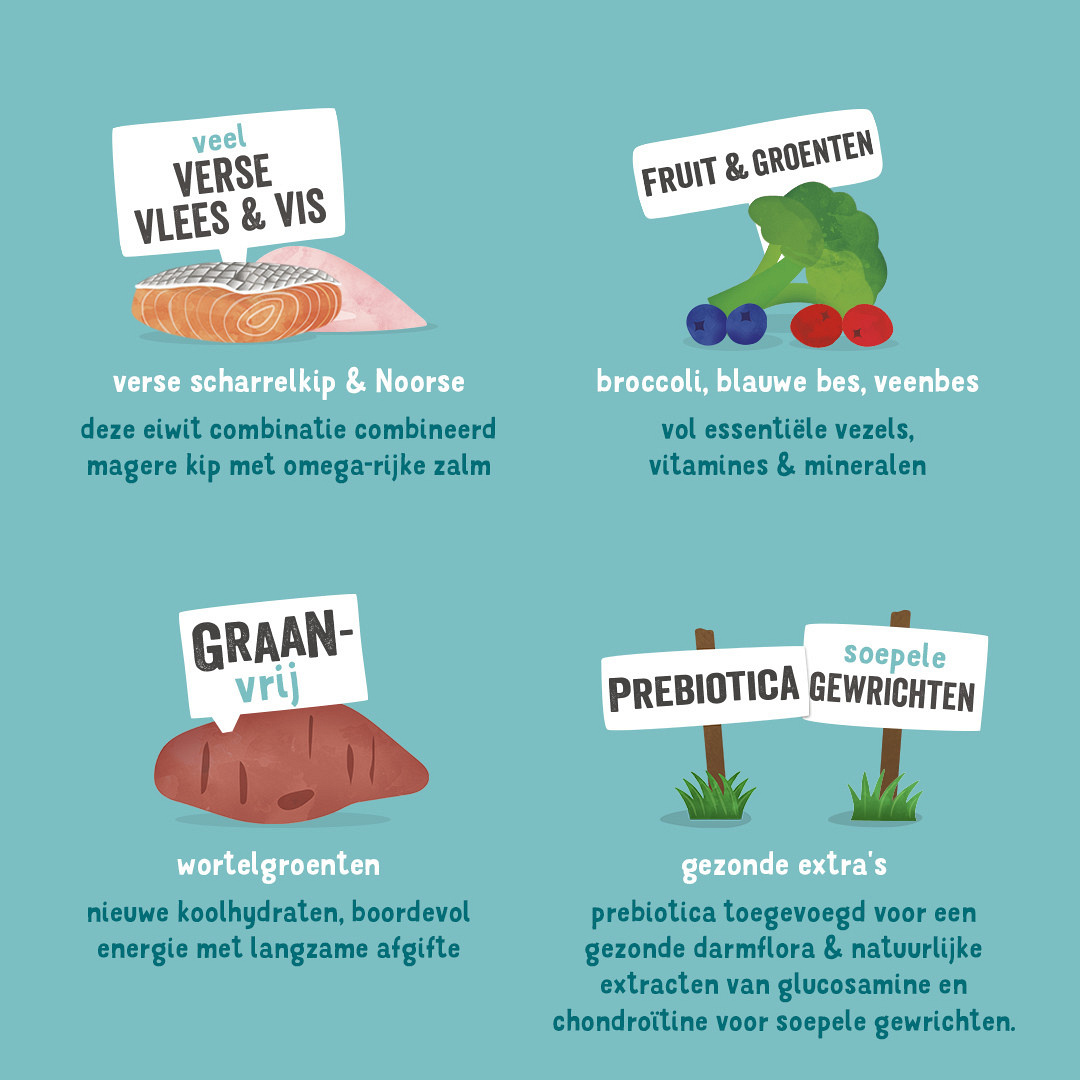 Samenstelling: verse kip 35%, bataten, erwten, verse zalm 5%, lijnzaad, erwteneiwit, kippensaus, mineralen, mannan-oligosachariden (MOS), fructo-oligosachariden (FOS), broccoli 0,04%, bosbessen 0,04%, vossenbessen 0,04%, cranberry's 0,04%, boerenkool 0,04%, maca 0,04%, goudsbloemblaadjes, brandnetel, braambesblaadjes, venkel, karwij, kamille, melisse, glucosamine, chondroïtinesulfaat.