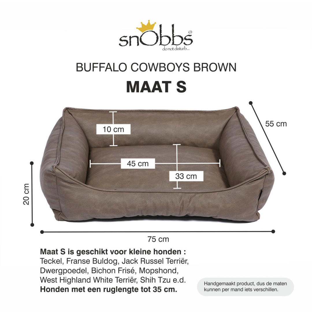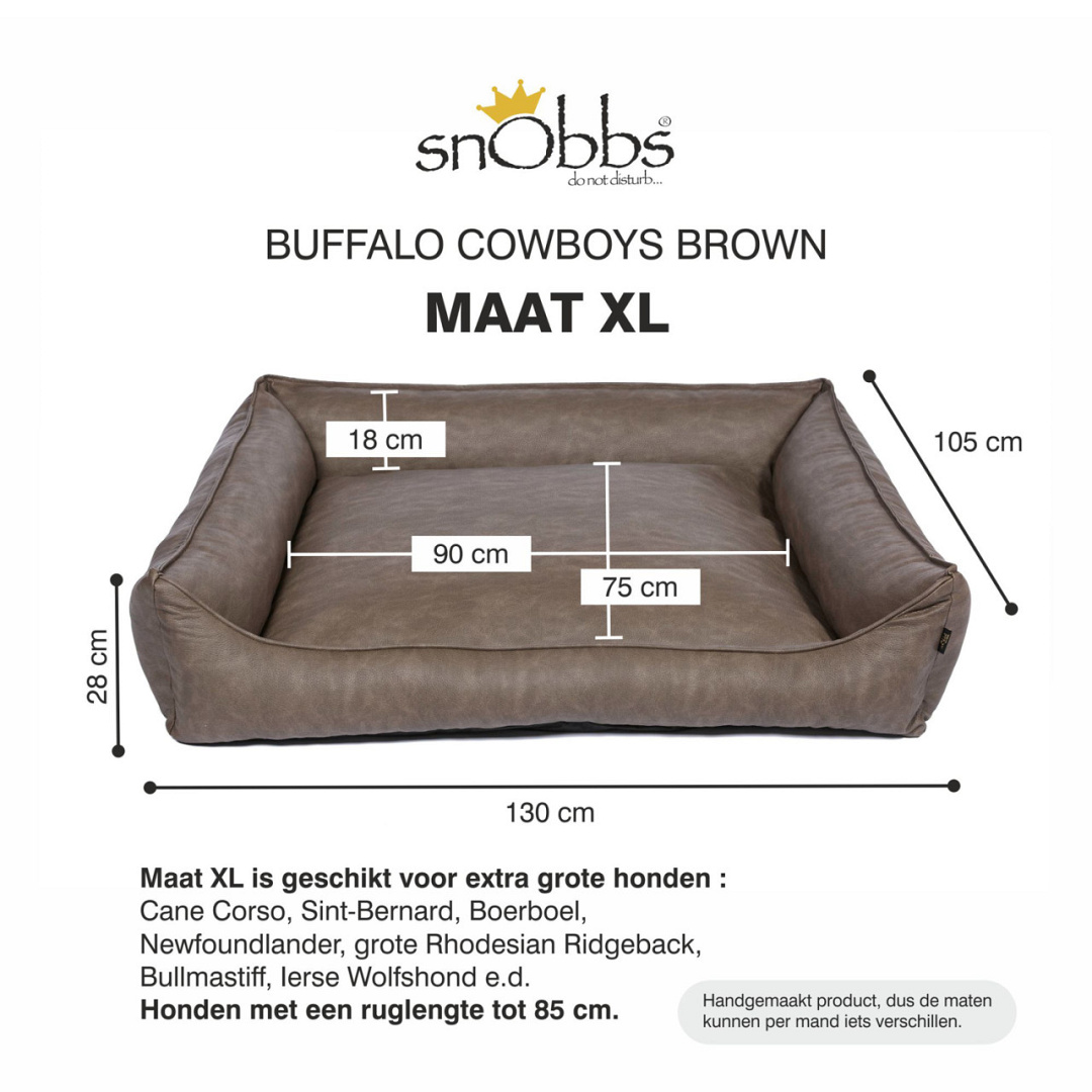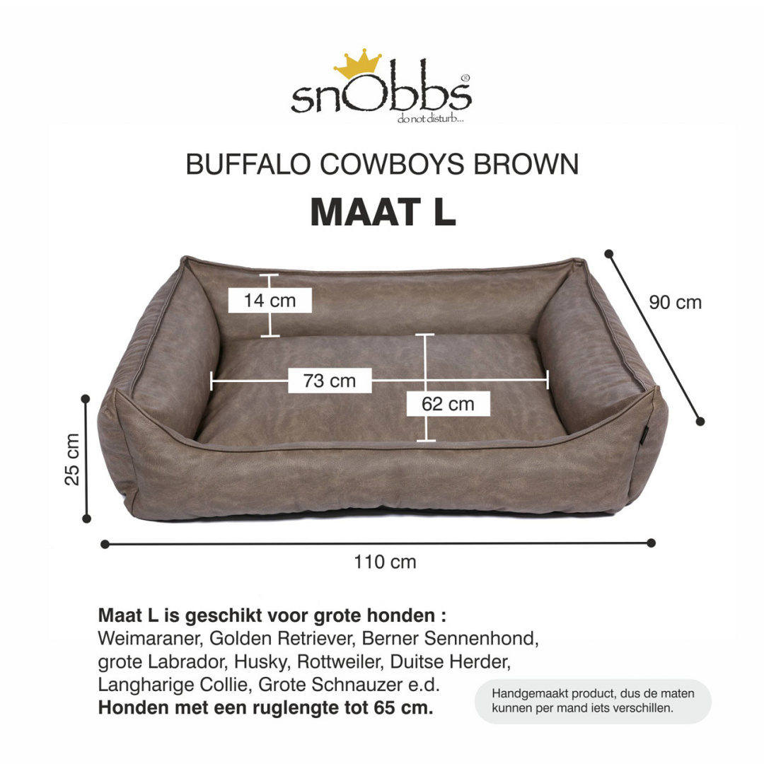 Het materiaal heeft een echte cowboyslook door de duidelijke nerf met structuur en gevlamde kleurschakering. Door het gemakkelijke onderhoud en de hoge kwaliteit kunstleder is deze mand zeer geschikt voor alle type honden. De Buffalo neem je eenvoudig af met een vochtige doek. Voor extra verzorging is er snObbs onderhoudsmiddel.
