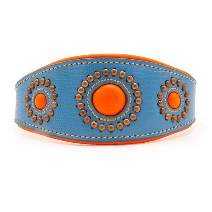De Dog with a Mission halsband Greyhound Jones is een prachtig blauwe halsband met een uniek design. De halsband is handgemaakt van stevig, dik leer en de binnenkant is gevoerd met zacht leer.