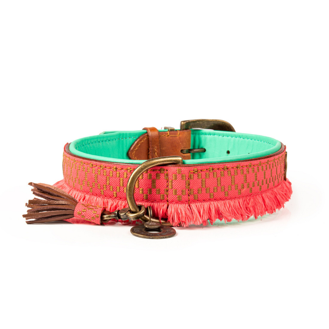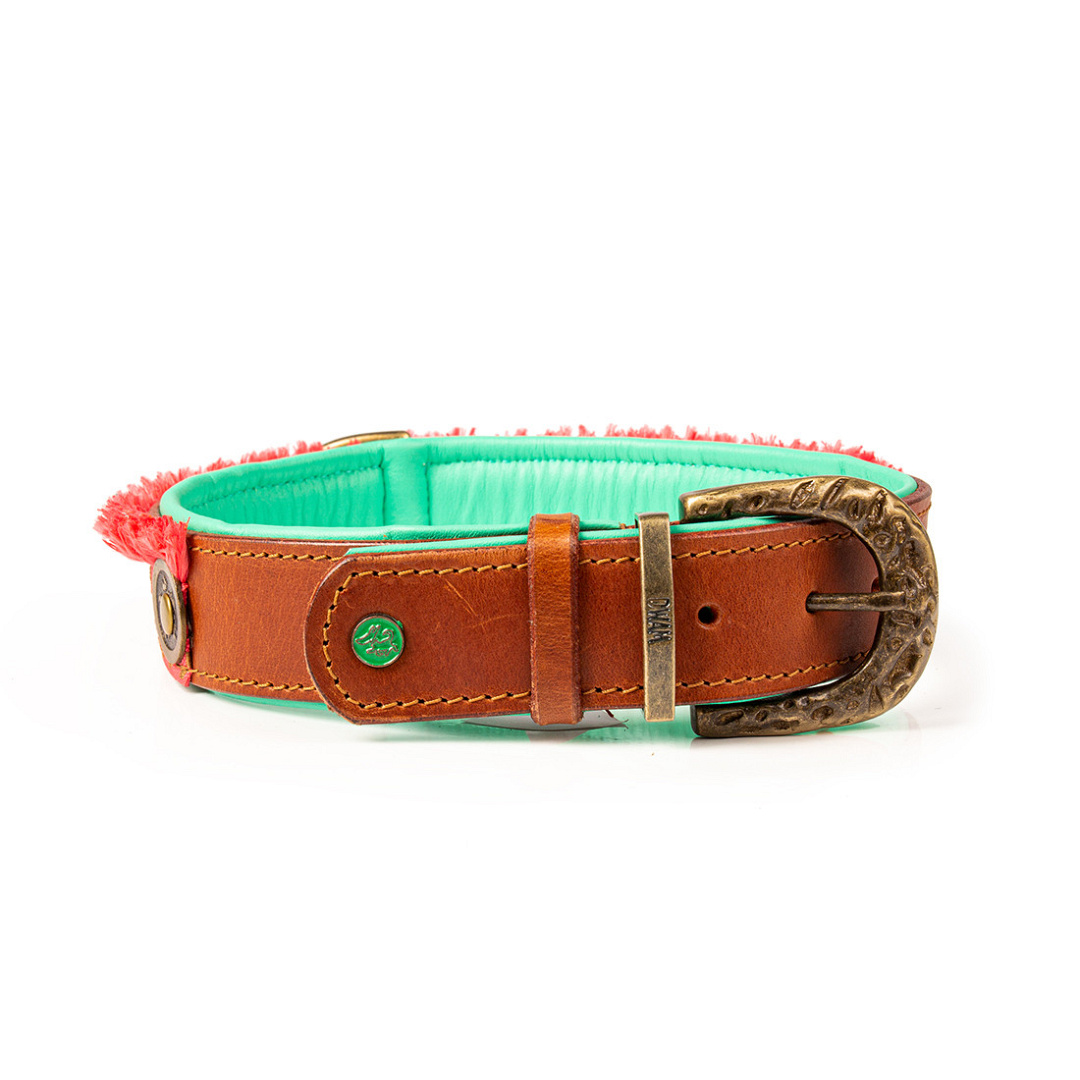De Dog with a Mission halsband Holly is een prachtige halsband met een messing gesp met reliëf, matchende studs en rand met franjes. Dit maakt de halsband de perfecte mix tussen speels en luxueus.