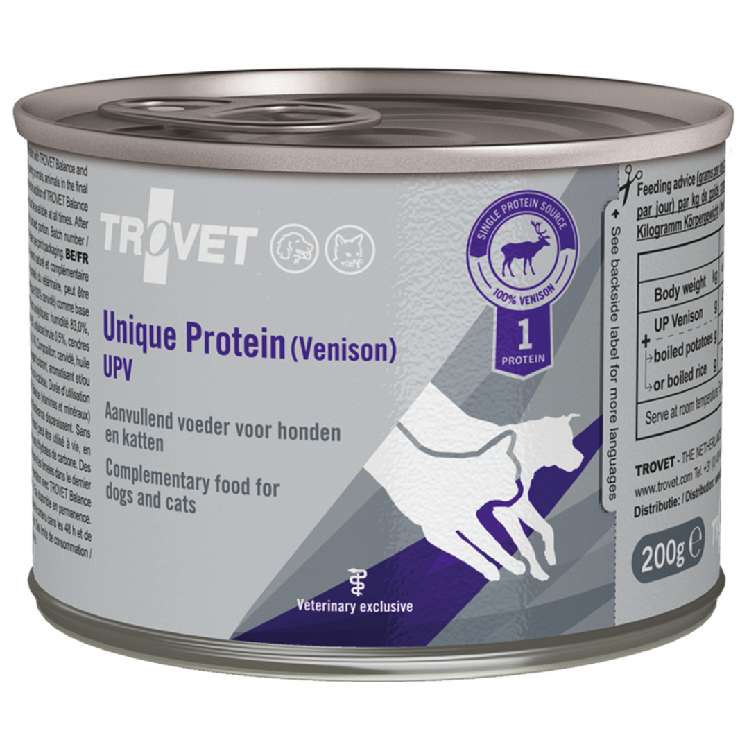 Trovet Unique Protein Venison UPV maakt het zelf koken voor jouw hond een stuk makkelijker. Het zelf bereiden een eliminatiedieet voor jouw hond of kat kan een hele klus zijn. Meestal zijn de bijzondere dierlijke eiwitten die de dierenarts voorschrijft moeilijk verkrijgbaar en is afwegen en bereiden van de voeding een tijdrovende bezigheid. Daarnaast verspreiden sommige vleessoorten een onaangename geur tijdens de bereiding.