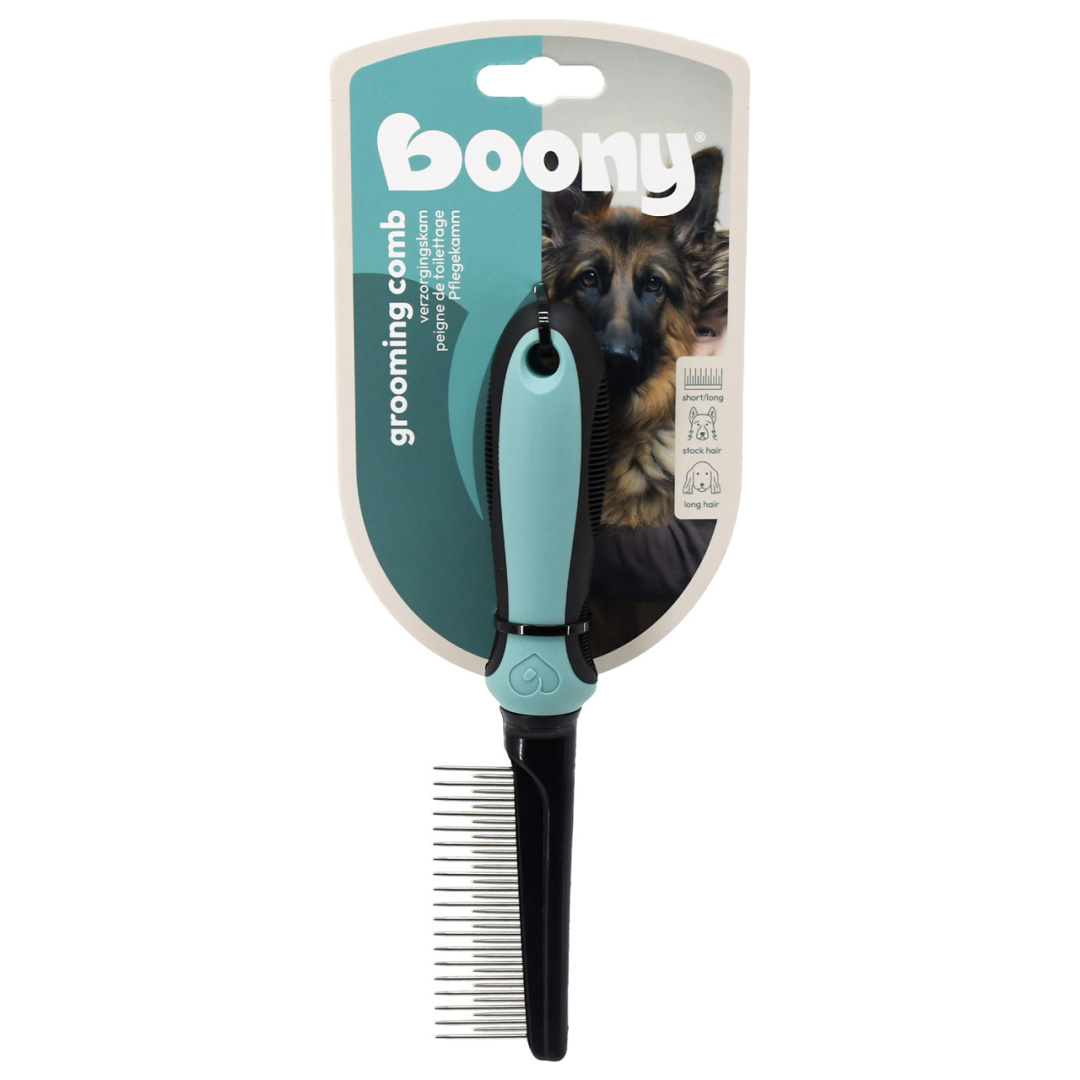 Deze Boony verzorgingskam is perfect voor honden met zowel een onder- als bovenvacht. De kam maakt de vacht los en verwijdert op een efficiënte manier losse haren, vuil en beginnende klitten. Zo blijft de vacht fris, gezond en klitvrij.