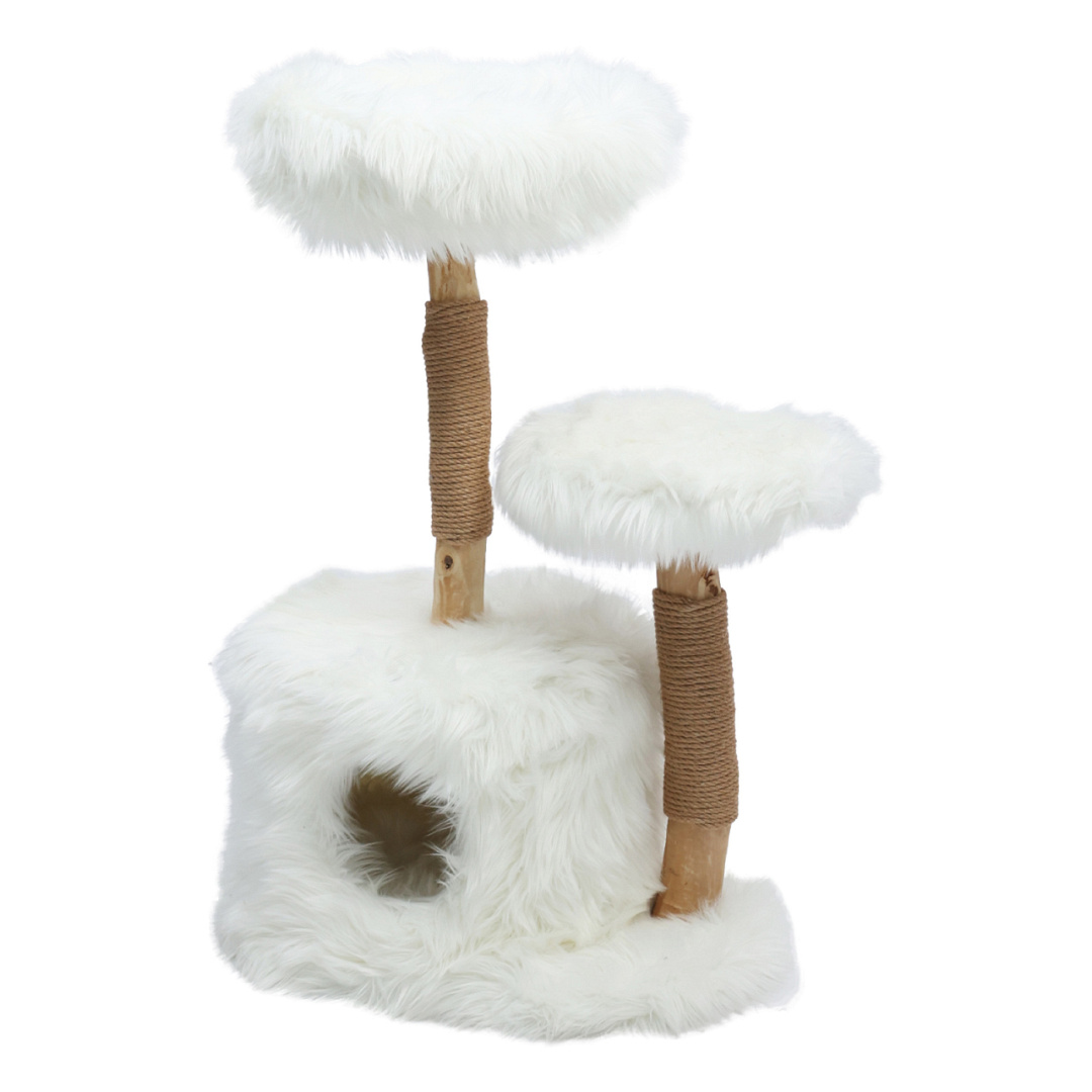 Uniek krabmeubel van natuurlijke houten stammen, met twee pluchen plateaus en een fijn holletje.