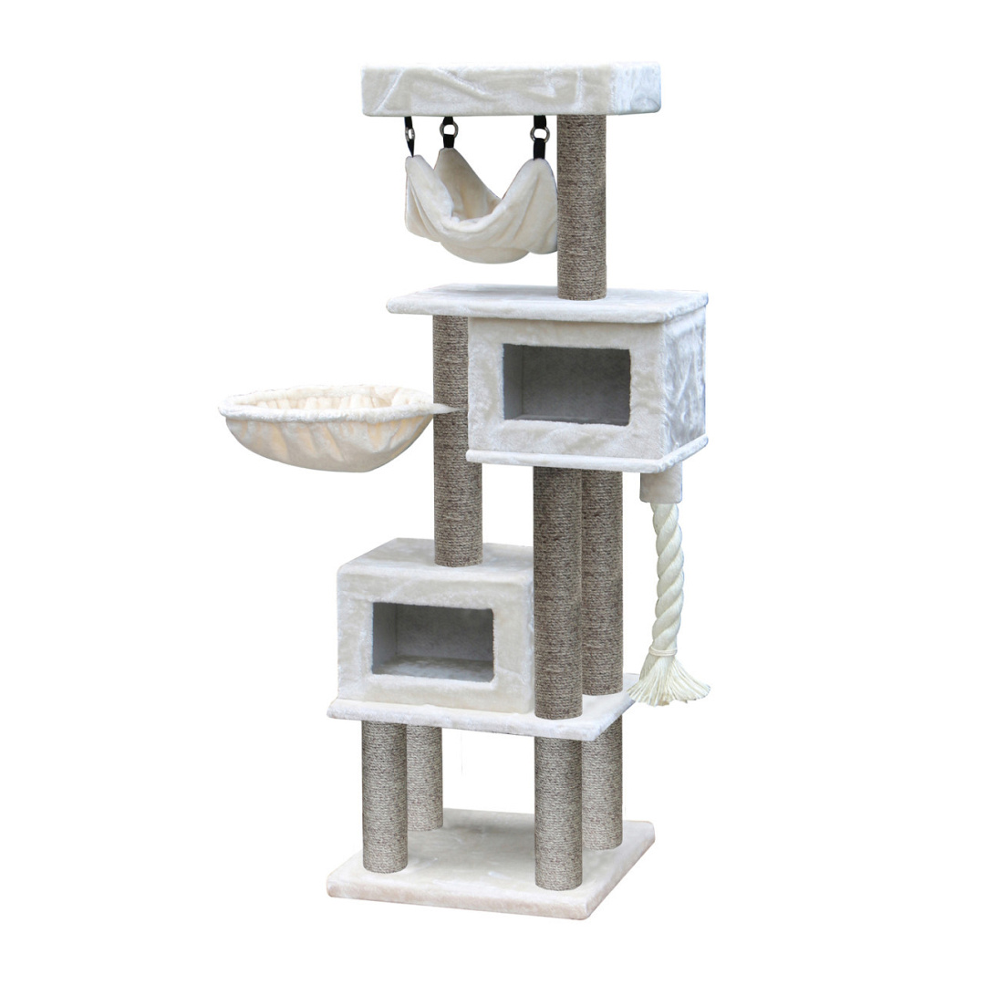 De massieve bodemplaat zorgt voor stevigheid en is compleet bedekt met heerlijk zacht pluche. Verder beschikt de Batuma over twee comfortabele slaaphuizen, met sisal omweven krabpalen, twee hangmatten om heerlijk in te liggen of te spelen en helemaal bovenop een pluchen ligplateau met opstaande randen. Voor extra speelplezier hangt er aan het bovenste slaaphuis een robuust touw.