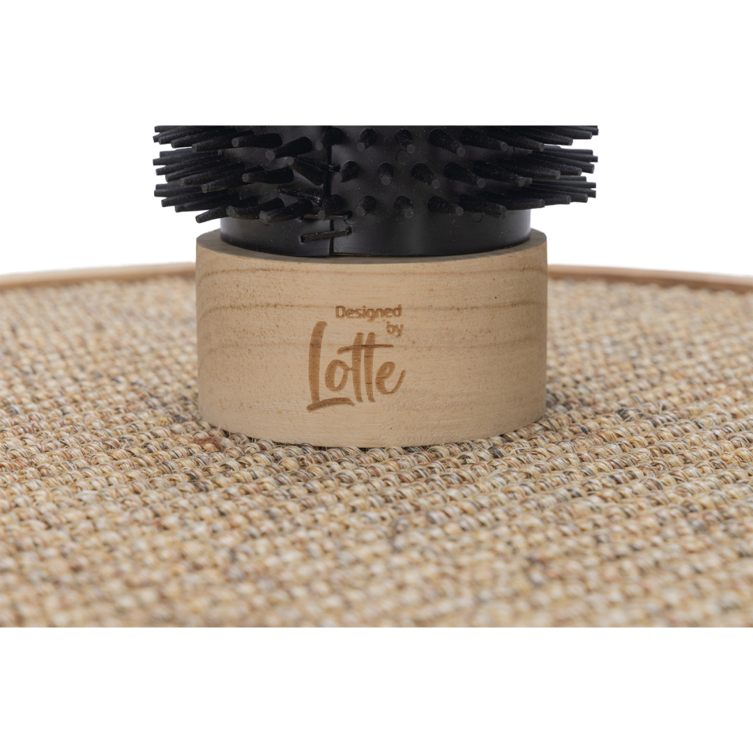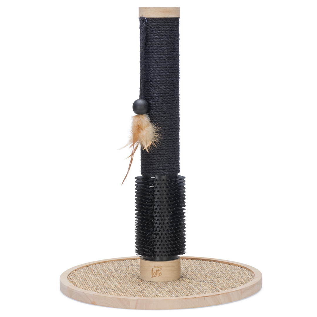 Laat jouw kat zijn of haar nagels en vacht verzorgen met de unieke Designed by Lotte krabpaal Fida. Deze stijlvolle krabpaal is gemaakt van rubberhout en heeft een stam omwikkeld met juten touw voor verticaal krabben. Krabt jouw kat ook graag horizontaal? Dan is de sisalmat op de bodemplaat perfect. Daarnaast kan jouw kat zijn of haar vacht verzorgen door kopjes te geven aan de borstel onderaan de krabpaal. De rubberen nopjes masseren de vacht, wat heerlijk aanvoelt. Uiteraard kan jouw kat ook spelen met deze krabpaal, want aan de stam is een touw met een balletje en veer bevestigd. Om je vloer te beschermen tegen krassen worden er stickers van vilt meegeleverd. Door de zwarte tinten en het lichte rubberhout zal deze krabpaal een pronkstuk zijn binnen jouw interieur.