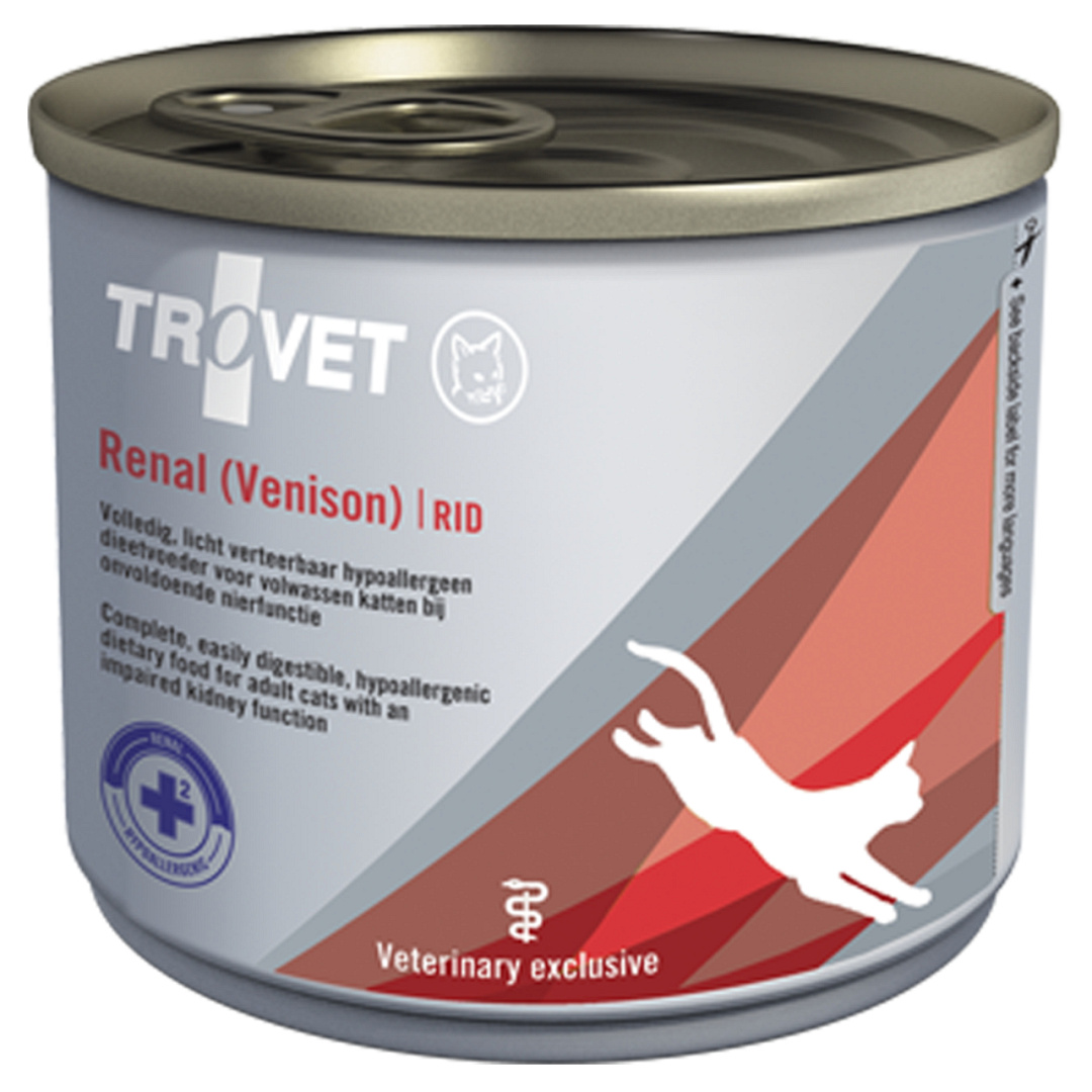 Trovet kattenvoer Renal Venison RID is speciaal afgestemd op de behoefte van volwassen katten met chronisch nierfalen. Het product bevat slechts één dierlijke eiwitbron (hert) en één koolhydraatbron (rijst) en is daarom eveneens geschikt voor katten met voedselovergevoeligheid.